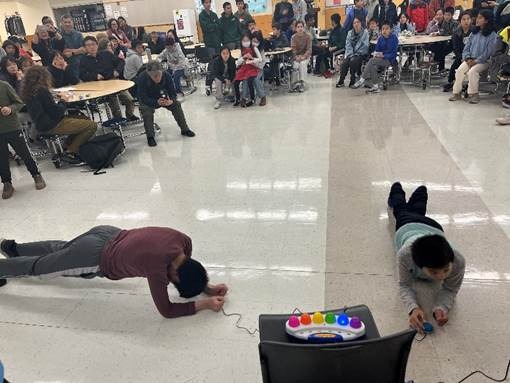 Two students participate head-to-head in the plank countdown semifinals